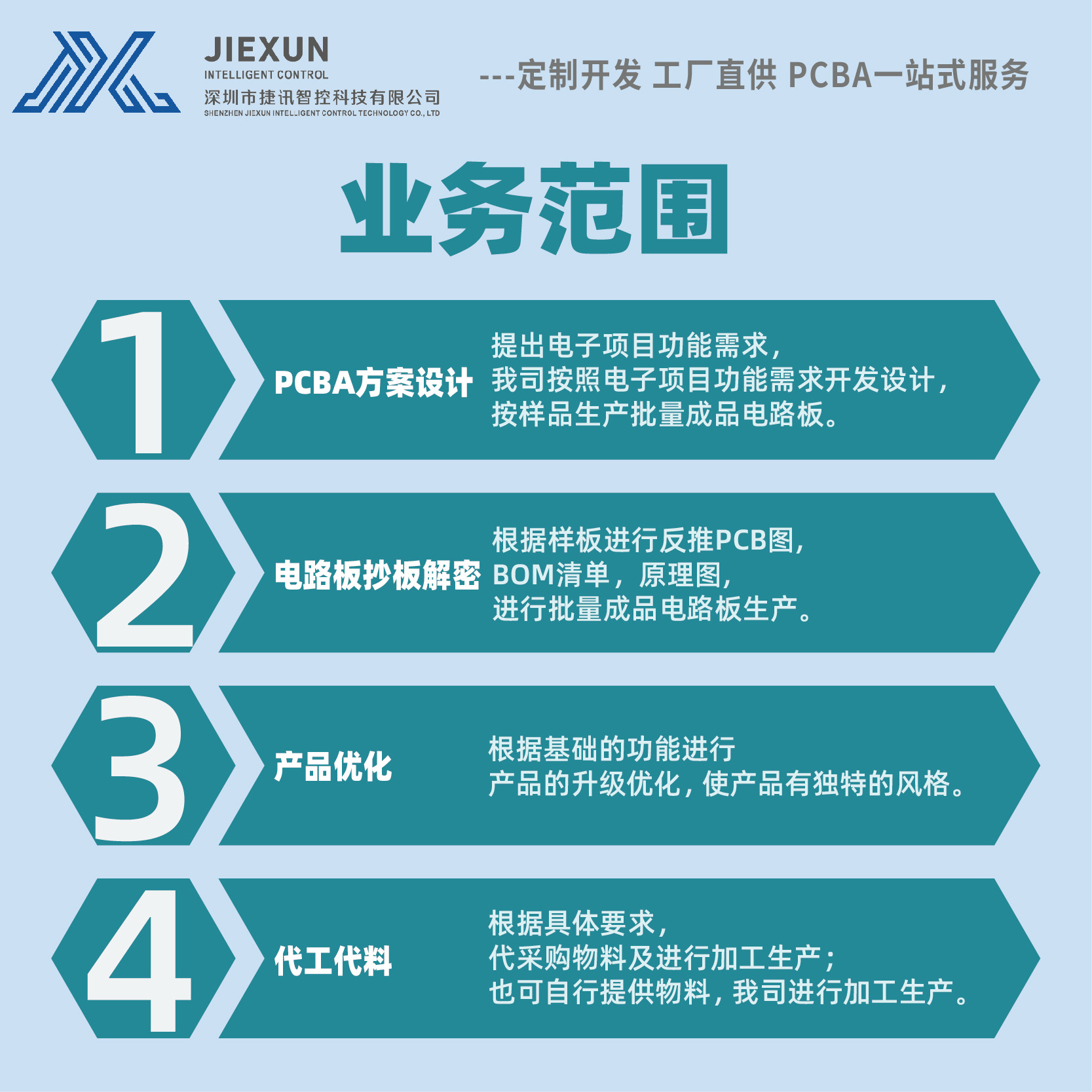 深圳市捷讯智控科技有限公司是一家专注于智能控制领域的高科技企业,公司的主要业务范围涉及深圳电子产品开发、电子方案设计:电子项目合作、控制板的研发,设计,生产等环节。我们公司拥有着优良的产品,良好的服务,精密仪器,高新的技术,配件设施精良,电子科技技术遥遥领先,产品附加值高,经济效益好。欢迎各位客户咨询,抓住商机,选择我们是您的正确选择。对于蓝牙音响、无线智能充电宝、筋膜枪、儿童智能早教机、卷、直发棒、智能宠物喂水器、拉杆蓝牙音响、美容仪器、助听器、吹风机、脱毛仪、无人机、AI智能、电子雾化、小家电控制板方案,闪灯方案等都有先进的解决方案。