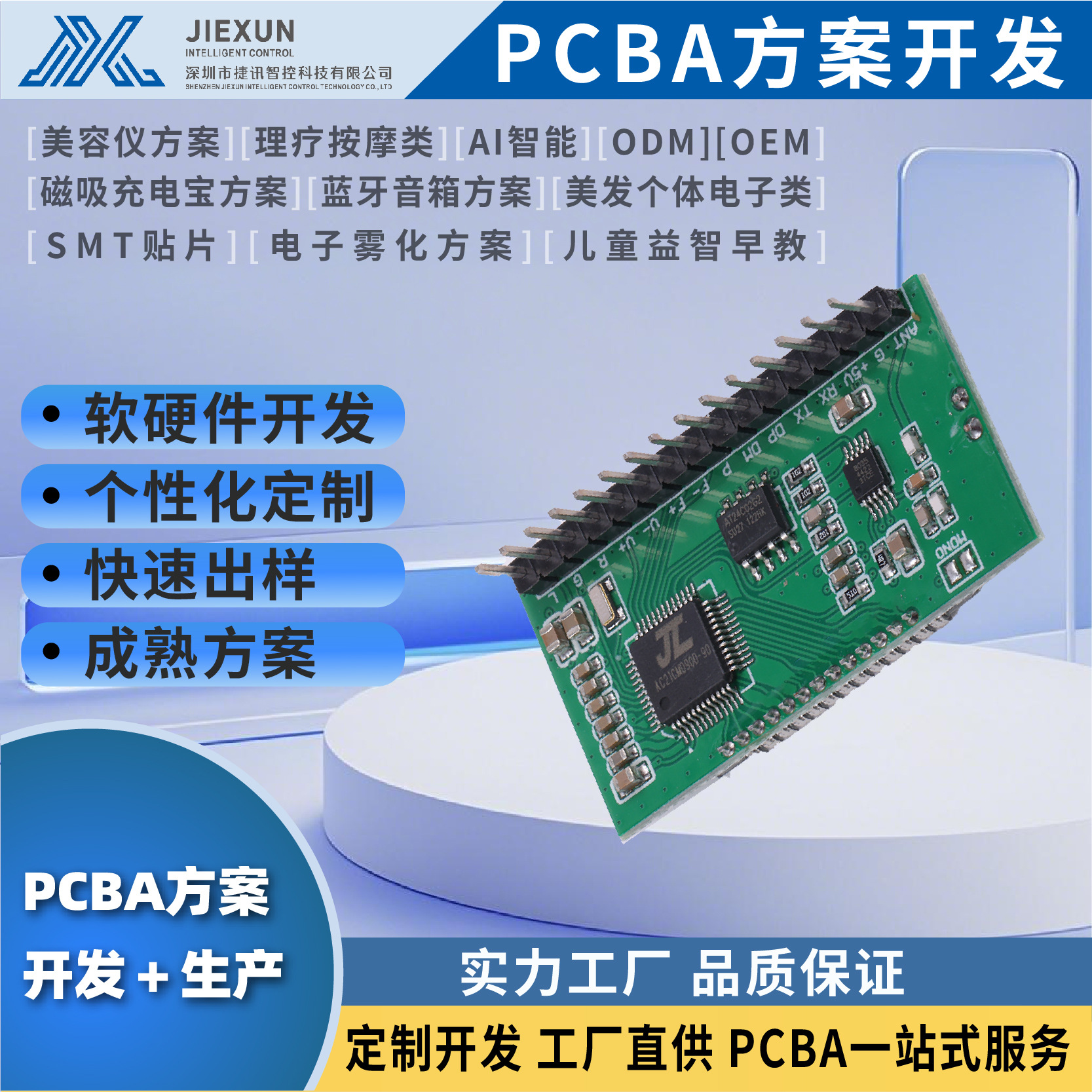 深圳市捷讯智控科技有限公司是一家专注于智能控制领域的高科技企业,公司的主要业务范围涉及深圳电子产品开发、电子方案设计:电子项目合作、控制板的研发,设计,生产等环节。我们公司拥有着优良的产品,良好的服务,精密仪器,高新的技术,配件设施精良,电子科技技术遥遥领先,产品附加值高,经济效益好。欢迎各位客户咨询,抓住商机,选择我们是您的正确选择。对于蓝牙音响、无线智能充电宝、筋膜枪、儿童智能早教机、卷、直发棒、智能宠物喂水器、拉杆蓝牙音响、美容仪器、助听器、吹风机、脱毛仪、无人机、AI智能、电子雾化、小家电控制板方案,闪灯方案等都有先进的解决方案。